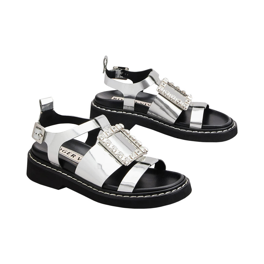 Cek salah satu rekomendasi dari voila.id, yakni seri Viv’ Rangers Strass Buckle Leather Sandals Argento. (https://voila.id/collections/all/products/roger-vivier-viv-rangers-strass-buckle-leather-sandals-argento)
