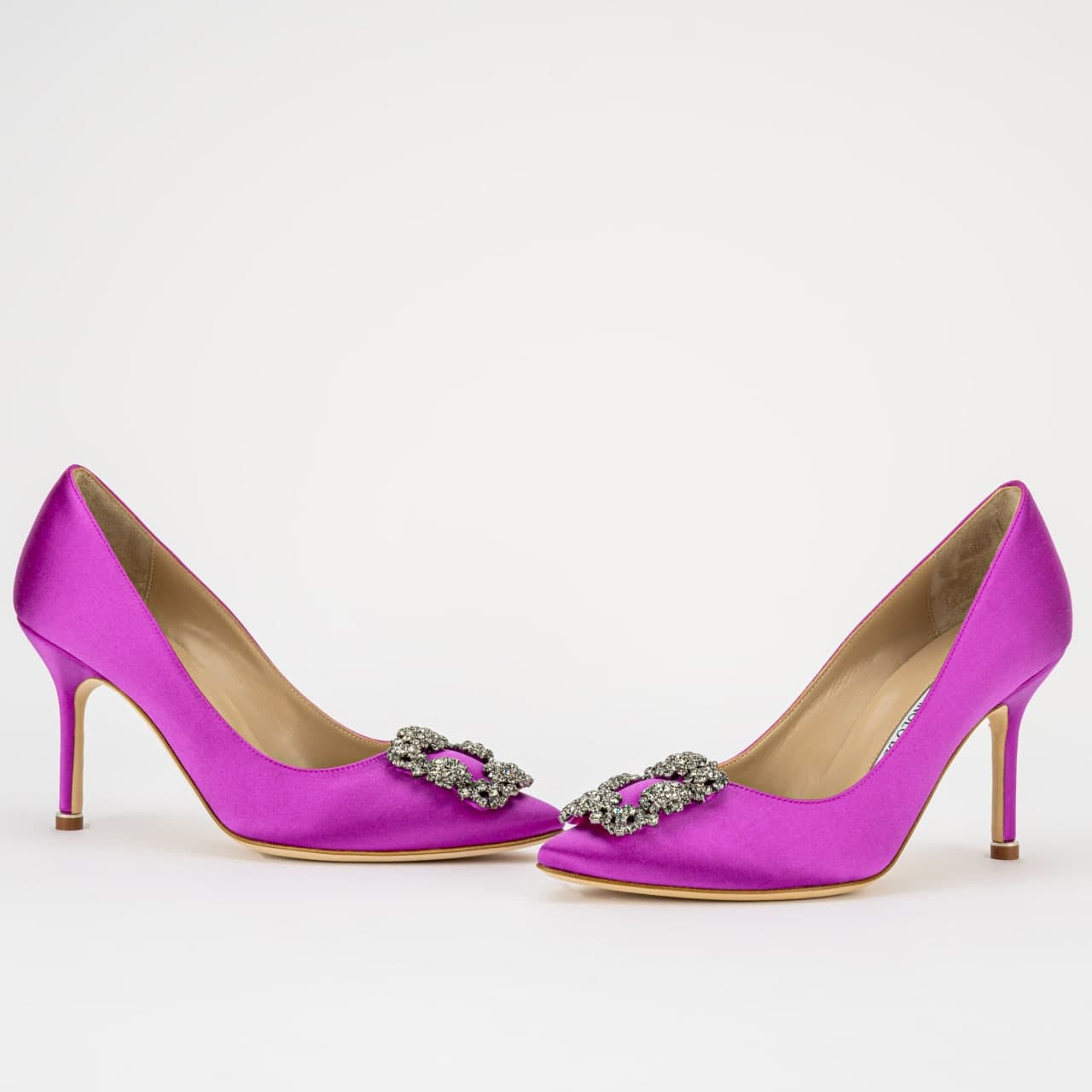 Cek salah satu rekomendasi dari voila.id, yakni seri Hangisi 90 Satin Pumps with FMC Crystal Buckle Magenta. (https://voila.id/collections/all/products/manolo-blahnik-hangisi-90-satin-pumps-with-fmc-crystal-buckle-magenta)