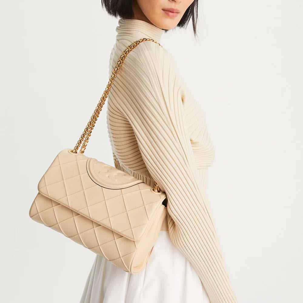 Tas Tory Burch terlaris di tahun 2023 selanjutnya adalah koleksi Fleming Soft Small Convertible Shoulder bag yang ikonis. Shoulder bag berwarna new cream ini adalah pilihan populer di kalangan bag enthusiast. Tas ini adalah contoh nyata dari tas yang memiliki citra elegan dan tahan lama. Tas ini terbuat dari bahan kulit nappa yang lembut dan berkualitas tinggi, yang memberikan kesan mewah pada tas tersebut.